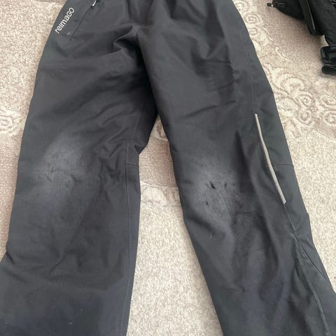 Reiman lasten toppahousut, jotka vaatii korjausta. Kuvissa näkyvimmät reiät. Lapsella oli nyt ekoilla pakkasilla päällä eikä palellut, mutta kosteustus taitaa loskakeleillä tulla läpi jos kovin konttaa ja istuu maassa.