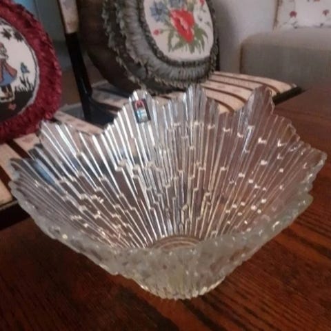 Revontulikulho. Käyttämätön. Halkaisija 23 cm. Suomalaista Humppilan lasitehtaan lasia. Tauno Wirkkalan suunnittelema.