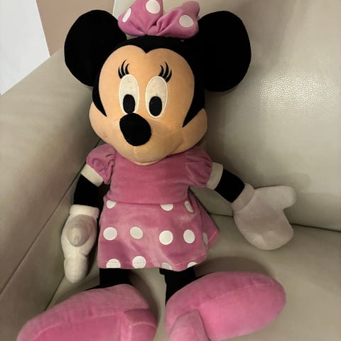 Disney Minnie Hiiri pehmolelu, jolla pinkki mekko ja rusetti. lasten leikkeihin ja keräilyyn. Pieniä tahroja löytyy mutta saa varmaan pois pesulla, ei haittaa käyttöä. Pehmolelua käytetty vain vähän, ollut kaapissa pitkään.