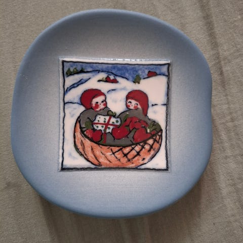 Arabian seinälautanen Tonttujen tanssi, valmistusvuosi 1980, halkaisija 12 cm. Kivitavaraa. Paino 138 g.