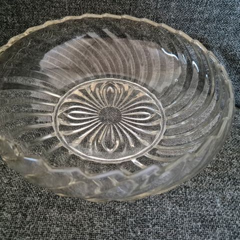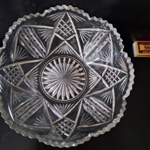 Kuvien vanha puristekristallikulho. Korkeus on noin 4 cm ja läpimitta 12 cm. Hyväkuntoinen!