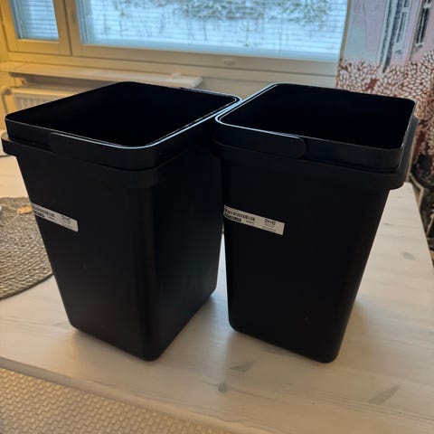 Mitat noin: 24 x 20 x 35 cm valkoista roska-astiaa tilavuudeltaan 10 litraa kunkin. Roska-astian mitat ovat noin 24 x 20 x 35 cm. Sopii hyvin esimerkiksi pieniin tiloihin ja on helppo pitää puhtaana.