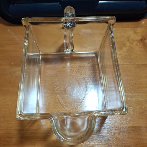 Kuuluu vanhaan lasiseen säilytyshyllykköön, jossa voi säilyttää sokeria, jauhoja jne. Kuvissa on mitat ja on palasia lähtenyt kulmista, muuten ehjä