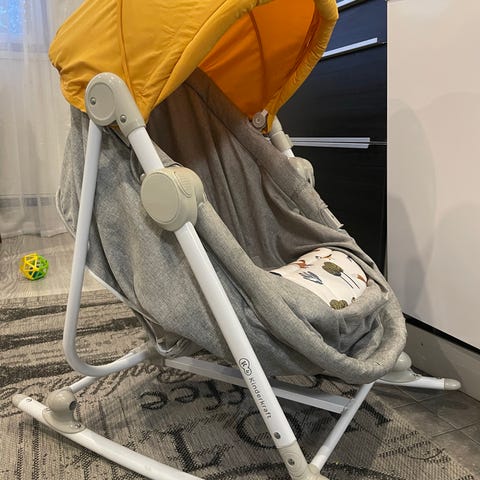 Babyton -merkkinen, kevyt metallirunkoinen sitteri jossa "tuulipukumainen" tekstiilipäällinen, mobile ja turvavyöt. Kaltevuutta voi säätää. Keinuva, mutta jaloissa stopperit.