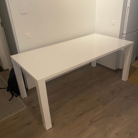 Kiiltovalkoinen ruokailupöytä. Kunto ok, ei pahempia jälkiä.
