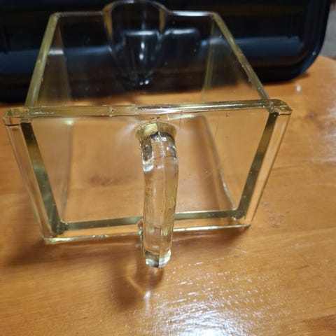 Kuuluu vanhaan lasiseen säilytyshyllykköön, jossa voi säilyttää sokeria, jauhoja jne. Kuvissa on mitat ja on palasia lähtenyt kulmista, muuten ehjä