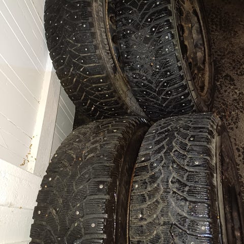Mahdollisesti melko vanhat talvirenkaat peltivanteilla. En osannut katsoa löytyykö valmistusaika, mutta kuvissa pitäisi näkyä kaikki tekstit, mitä renkaissa on. Kunnostakaan en osaa sanoa, mutta kuvia on mahdollista saada lisää.