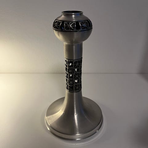Sarpanevan pronssinen Pitsi- kynttilänjalka. Korkeus n. 17cm ja pohjan leveys 9cm. Suuaukossa lommo, mutta ei haittaa käyttöä.