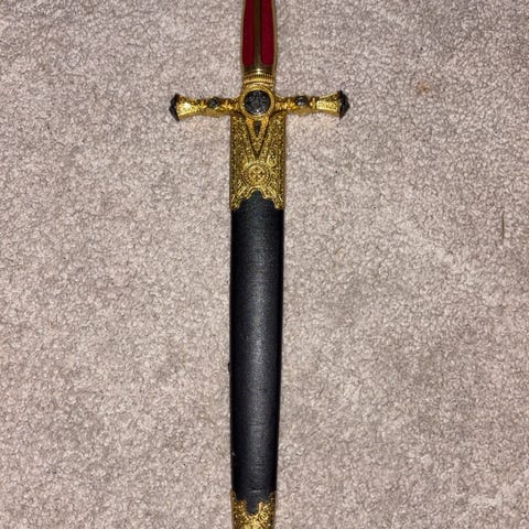 Tämä ei ole uusi koristekopio vaan selvästi vanhempi seremonia-/lahjaesine — tyypillinen statussymboli tai muodollinen lahja, ei sotilasase.