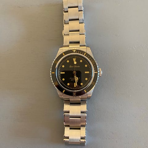 Mukaan paketti, kello, upea nahkaranneke ja San Martinin alkuperäinen metalliranneke jatkopaloineen. Eli kaksi ranneketta.
