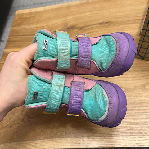 Affenzahn lasten talvikengät, koko 26. Kengät ovat väriltään pinkki ja violetti. Materiaalina on vettähylkivä kangas ja kumipohja, joka tarjoaa hyvän pidon talviolosuhteissa. Kengissä on lämmin vuori, joka sopii kylmiin sääolosuhteisiin. Kiinnitys tapahtuu nyörityksellä ja tarranauhalla, mikä helpottaa pukemista ja säätämistä.
