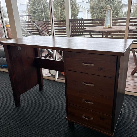 Hieno tammesta valmistettu koko puinen työpöytä/ruokapöytä. Pintaan on laitettu laadukas Osmo öljyvaha joka on todella kestävä vettä ja kuumuutta vastaan, ja on lisäksi helppo hoitoinen ja huoltoinen. Pöydän toisella pitkällä sivulla 3 vetolaatikkoa pienen tilpehöörin säilytykseen.