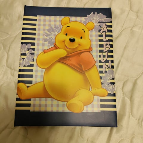 Disney Nalle Puh valokuva-albumi, jäänyt käyttämättä. Albumissa on nauhakiinnitys ja sisäsivut valokuvien kiinnittämiseen.