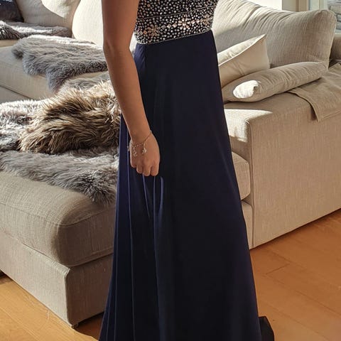 BELLA:n sininen juhlapuku, joita tytär käyttänyt vanhojen tansseissaan. Hän oli silloin kokoa 36 ja sisäkuminauha tuntui hänestä löysältä, joten ompelin niistä pienet sisäänotot. Nämä saa helposti purettua sillä en leikannut mitään pois.