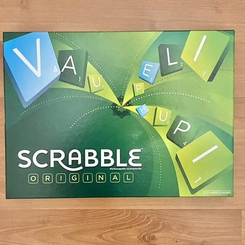 Peli, jossa keksitään sanoja annetuista kirjaimista. Pelattu vain pari kertaa, joten erinomaisessa kunnossa ja kaikki tallella.