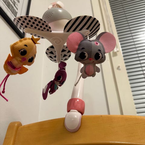 Myydään pinnasänkyyn kiinnitettävä mobile. Kolme eri musiikkivaihtoehtoa, valotoiminto. 20€