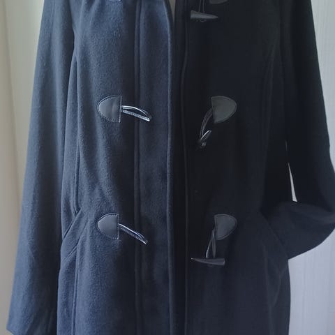 Uusi Zhenzin musta duffelitakki ,materiaali 10% villa,70%polyester, 20%ackryl.