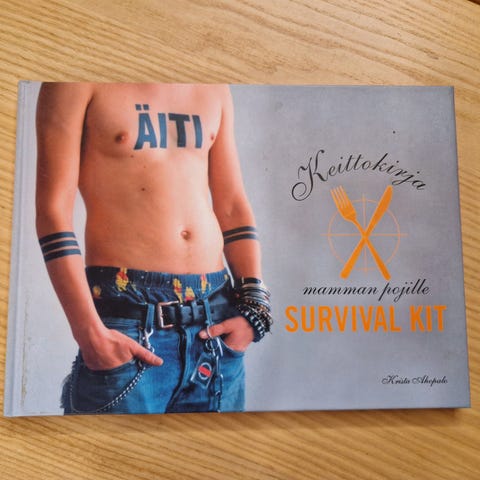 Krista Ahopalo Survival Kit mammanpojille on keittokirja, joka sisältää erilaisia ruokaohjeita. Hyvässä kunnossa. Haku Kallio tai toridiili