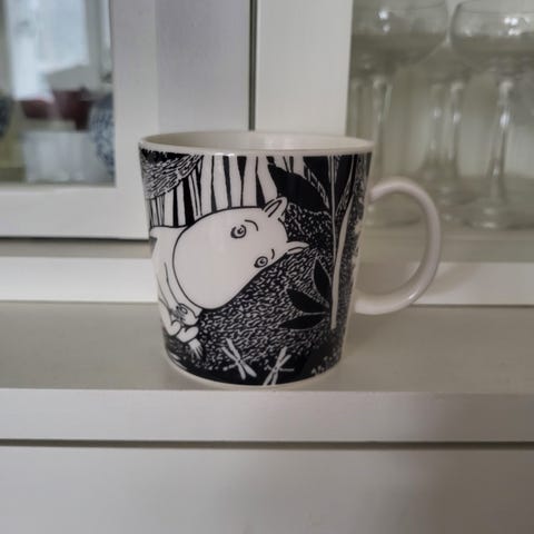 Käyttämätön/uusi tarrallinen Arabia Muumi Muumipeikko unelmoi keräily muki, mustavalkoinen. Vuosi 2005.