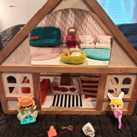 Erilaisia kalusteita nukkekotiin. Pääosin ehjiä, kellosta puuttuu kellotaulu.