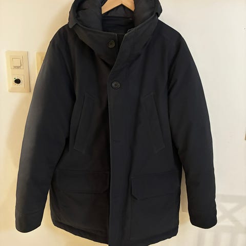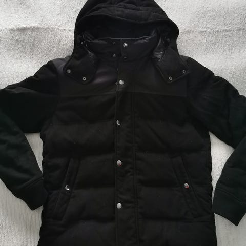 Lämmin, mutta kevyt takki. Huppu on neppareilla irrotettavissa.