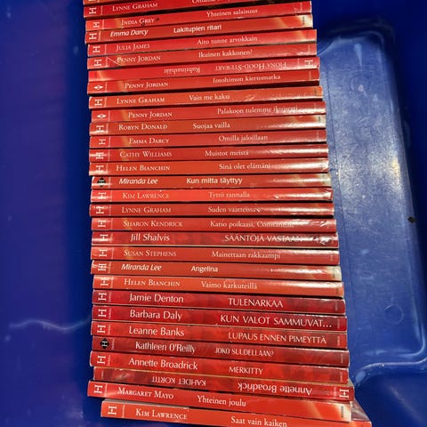 2e/kpl. Harlequin Kirjasarja sisältää useita suomenkielisiä romanttisia romaaneja. Kirjat ovat pehmeäkantisia ja sisältävät eri kirjoittajien teoksia, kuten "Lapungin luita", "Jouluna ollaan yhdessä", "Kesälupauksia", "Rekkauskirja hiekassa" ja "Avioliittolupauksia". Kirjasarja sopii lukijoille, jotka etsivät kevyttä ja viihdyttävää lukemista suomeksi. Postitus onnistuu hintaan lisätään siihen tulevat kulut. Kirjoja on tulossa lisää myyntiin kunhan kerkiän ne kuvata :)