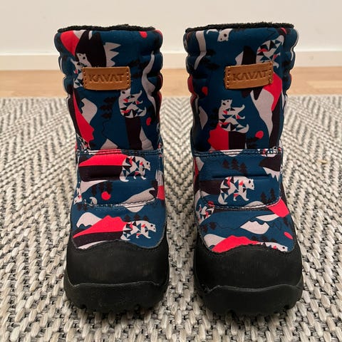 Kamik -merkkiset lasten talvisaappaat, koko 27, n. 16,6cm pohjallisen pituus, unisex-malli. Varren materiaali on ruskeaa mokkaa ja sisävuori on lämmin ja pehmeä. Ulkopohja on mustaa kumia, joka suojaa märältä. Kengissä on nyöritys ja pikakiristys.