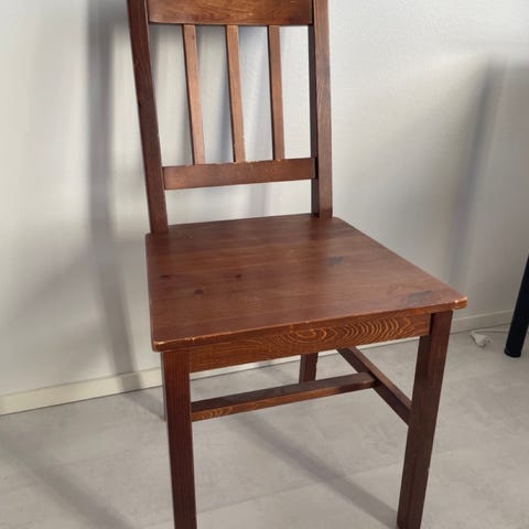 Puinen ruokapöydän tuoli, jossa on pystyrimoista koostuva selkänoja ja vihreä kangasverhoiltu istuin. Runko on lakattua puuta, ja tuoli sopii esimerkiksi ruokailutilaan tai keittiöön. Kuvissa näkyy myös erillinen vaalea tuolihuppu, joka voidaan asettaa tuolin päälle. Yhdessä kuvassa näkyy rungossa oleva vaurio tai kuluma, joka kannattaa huomioida kuntoa arvioitaessa.