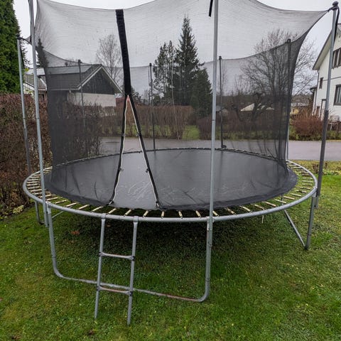 Iso vanha trampoliini. Jousien suoja hävinnyt, suojaverkko rikki mutta suojaa vielä vähän. Itse trampoliini ehjä. Hakija voi itse päättää jos jättää suojaverkkoa vai jos ottaa sitä.