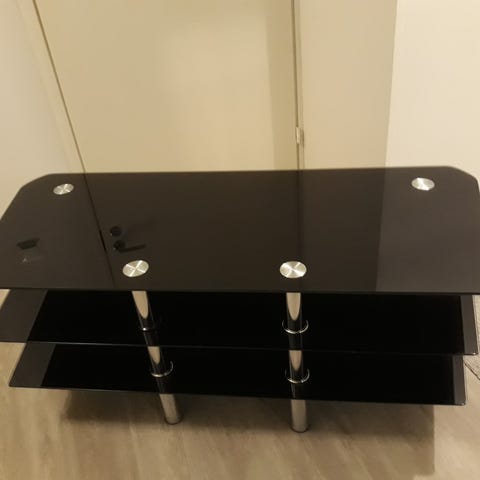 Lasinen TV taso. Leveys leveämmästä kohdasta 120 cm, kapeampi kohta 108 cm.