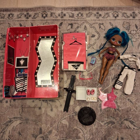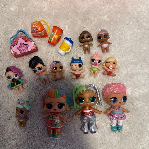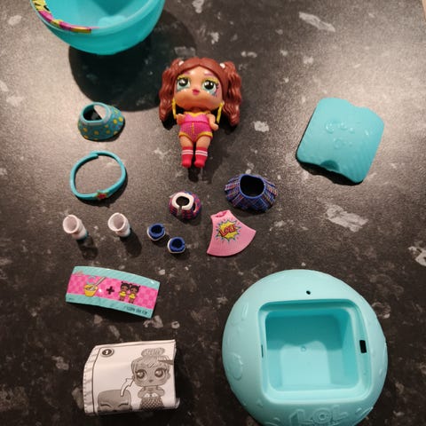 L.O.L. Surprise lasten lelusetti, joka sisältää useita pieniä leluelementtejä ja vaaleanpunaisen pallon. Lelut ovat suunniteltu lapsille ja ne sopivat leikkeihin ja keräilyyn.