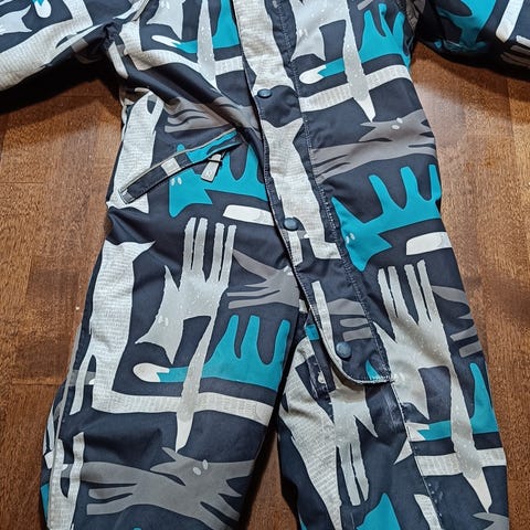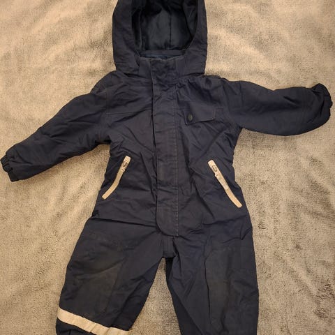 Vauvn/taaperon paksu ja lämmin toppapuku. Toinen vetoketju lähtenyt alusta huonosti. Voi varmaan korjata (en ole kokeillut). Hakaneula ollut pysäyttämässä vetskarin ja hyvin toiminut.
