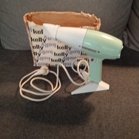 Toimiva, lähes käyttämätön Solis hiustenkuivaaja telineellä sekä hiustenkuivaushattu, vuodelta 1967 ja alkuperäisessä laatikossaan.