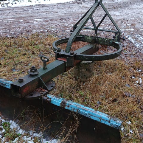 Järeä perälevy vaikkapa talven lumihommiin. Jonkun paikallisen sepän tekemä on. Leveyttä löytyy 270cm. Hitsattu itse tuollainen kappale tuohon jotta saa trukilla siirreltyä ja kyytiin nostettua.