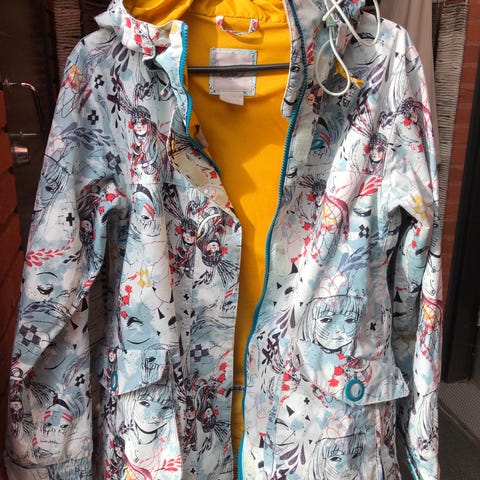 Materiaali 100% kierrätettyä. Takissa on vetoketjulliset taskut ja säädettävä huppu. Todella hyvässä kunnossa, ainut kuluma on hupun toisessa nyörissä (ks. Kuva).