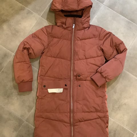 Violetti kevyesti topattu talvitakki. Muuten hyväkuntoinen mutta huppu puuttuu ja oikeassa hihassa tahra (kuva).