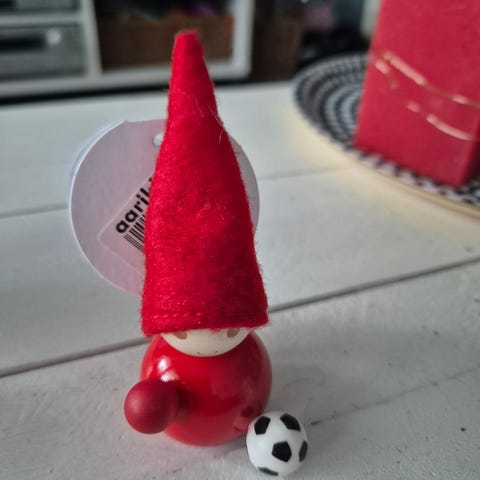 Puinen kehys, jossa on punainen pieni tonttupoika. Todennäköisesti Aarikan. Esim. askarteluun.