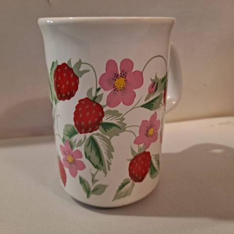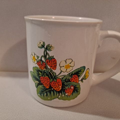 Mansikkakuvioinen muki, jossa valkoinen pohjaväri ja punaisia mansikkaprinttejä. Soveltuu kuumille ja kylmille juomille, kuten kahville, teelle tai kaakaolle. Perinteinen korvallinen malli helpottaa mukin käsittelyä arjessa.