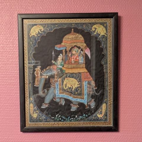 Matkamuistoksi Intiasta tuotu pieni maalaus kankaalle. Kotona Suomessa viety kehystäjälle, joka upeilla kehyksillä ja kahdella voimakkaan värisellä paspatuurilla loihti pienen aarteen!