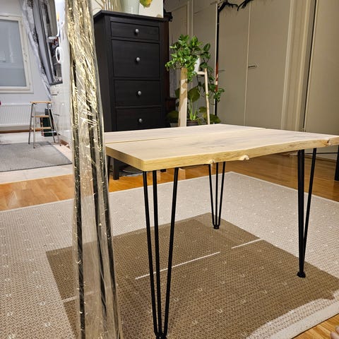 2. ja 3. kuva valmistamani sohvapöytä (ei myynnissä) jossa samanlaiset jalat. Sis muoviset suojat jalkoihin. Kantavuus 100 kg / jalka. Eli ei tutise ja tärise.