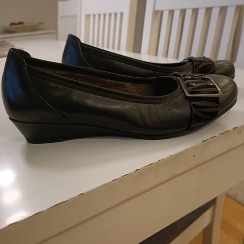 Käyttämättömät, matalakorkoiset ballerinat. Yhdistelmä kangasta ja nahkaa.