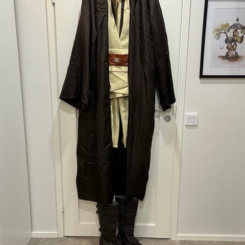 Star Wars teemainen Mace Windu asu. Täydellinen asu nkkareihin tai muihin naamiaisiin. Asu sisältää kaavun, aluvaatteet, housut, nahkaiset poikkiliinat, vyön, sekä nahkaiset varsikengät. Kengät kokoa 43, asu näyttää XXL. Valomiekka ei kuulu asuun.