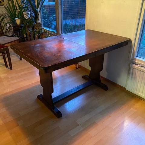 Vanha puuovi mustan metallitangon sisällä. Lasikansi. Pöytä ollut todella vähäisellä käytöllä eikä siinä ole havaittavissa mitään käytön jälkiä.