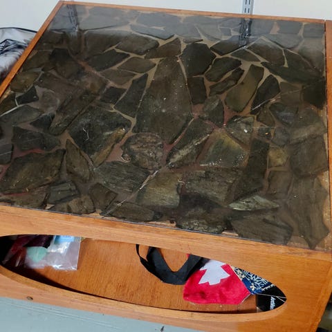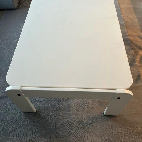 Annetaan sohvapöytä. Pöytä muuten siistissä kunnossa, paitsi pieni pala lohjennut ja yhdestä jalasta puuttuu jalansuoja. Ei vaikuta käyttöön.