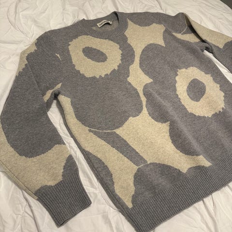 Marimekko Neule beige väri, koko S, naisten pusero. Valmistettu neulemateriaalista, jossa on kukkakuviointi. Sopii arkipukeutumiseen ja viileämpiin olosuhteisiin.