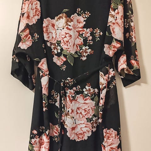 Pitkä mekko sifonkia, koko S. Mustalla pohjalla keltaisen/oranssin sävyisiä kukkia. Vyötärön leveyttä voi säätää narujen avulla.