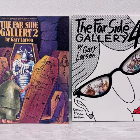 Gary Larsonin A Far Side collection- sarjakuvat 90- luvulta, pehmeäkantiset, molemmissa Kukunor:n hintalappu viimeisellä aukeamalla.