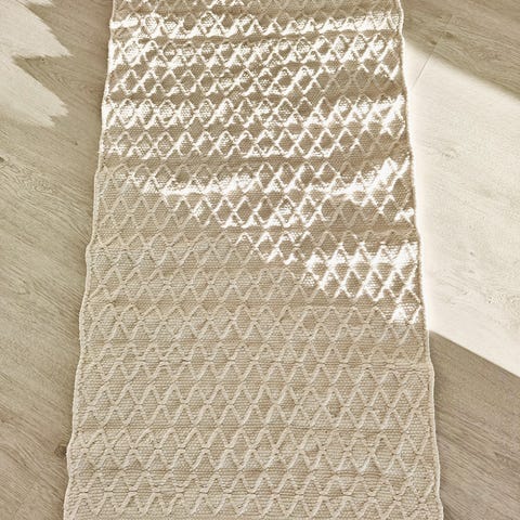 Matto, reunassa höyhen koristelu (yksi koriste/pääty, sivu), 100%puuvilla. Leveys n. 68cm, syvyys n. 50cm. Pesu 40 astetta. Käyttämätön.