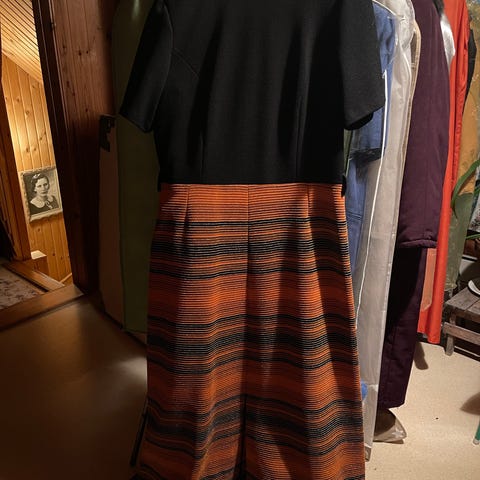 Jonku itse tekemä, vuoreton, Paisley-kuvioitu mekko 70-luvulta. Polyesteriä. Kai-kai 55cm, pituus 104cm. Hihan pituus 38cm.
