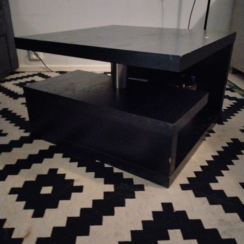 Musta puinen sohvapöytä, keskikokoinen malli, jossa on tukeva taso ja alahylly lisäsäilytystilaa varten. Pöytä sopii olohuoneen käyttöön ja tarjoaa käytännöllisen pinta-alan esineiden asetteluun.